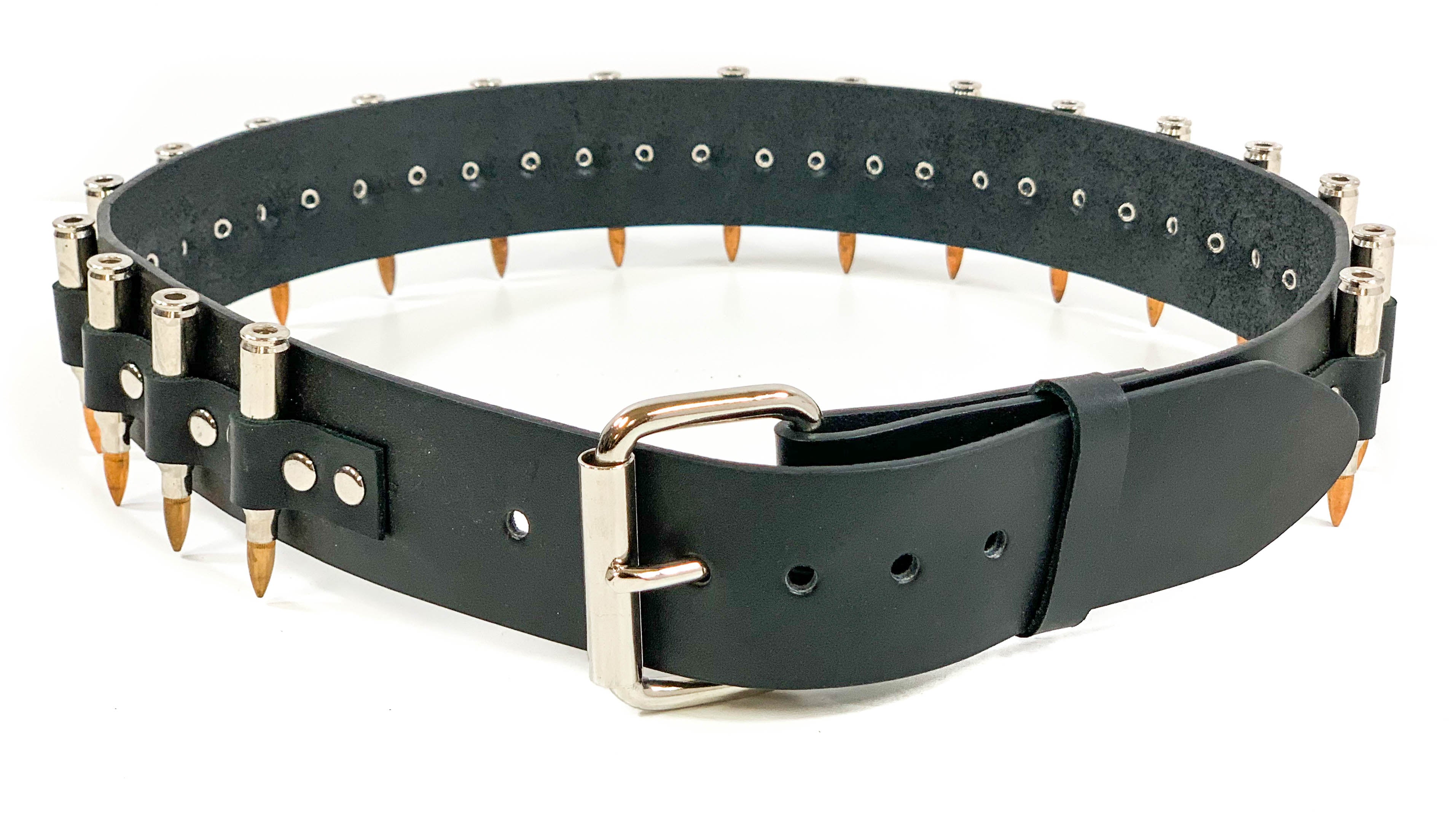 BLACK LEATHER BELT, NICKEL SHELL BULLETS, COPPER TIP, 1 3/4" WIDE Read more