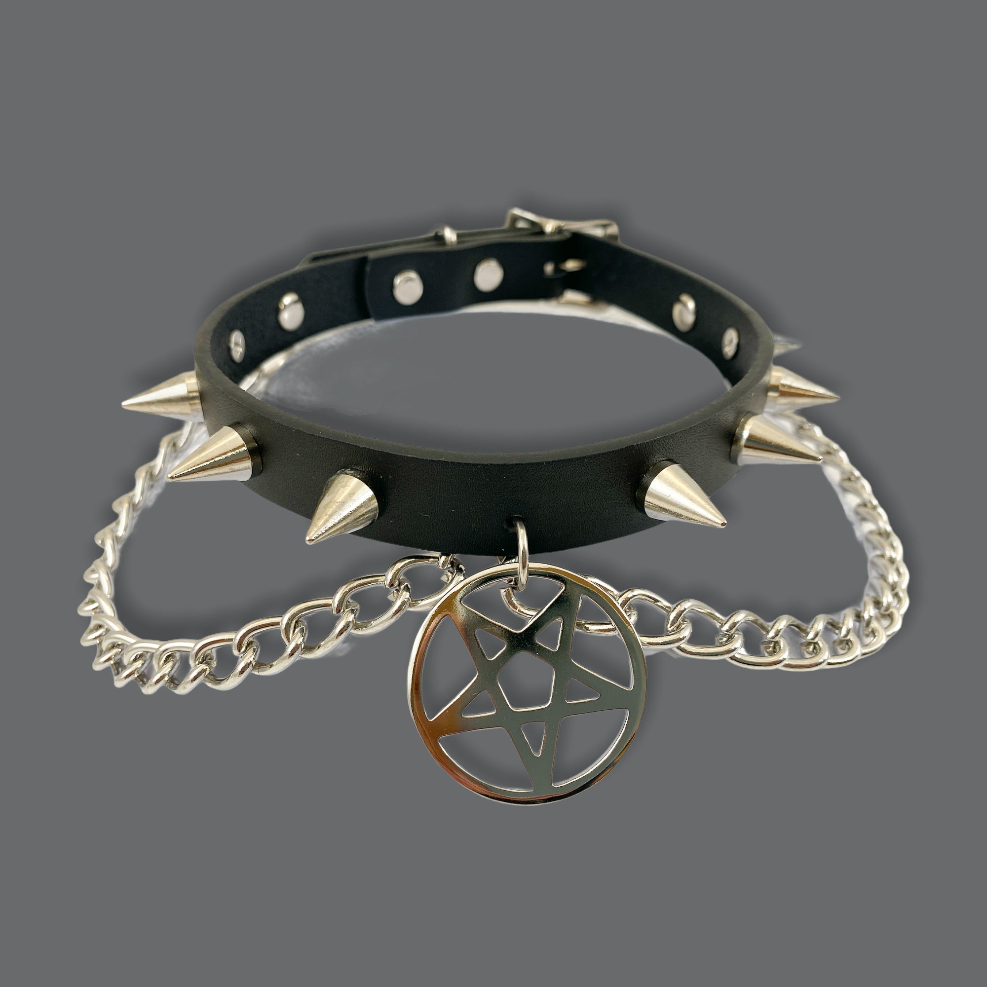 3/4" CHOKER WITH 2" PENTAGRAM RING, 1/2" SPIKE, AND 2.5 MM HANGING CHAIN Read more
