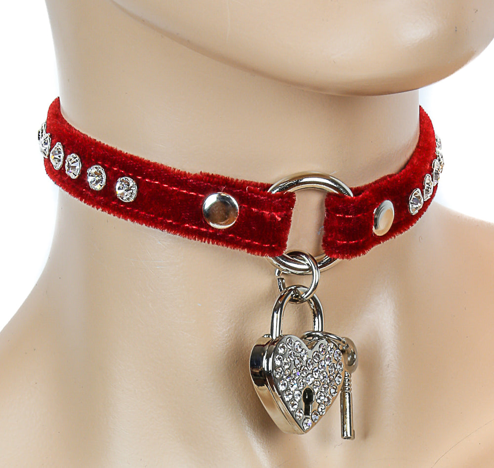 FC145VEL-HT VELVET -O- RING CHOKER WITH RHINESTONE HEART LOCK