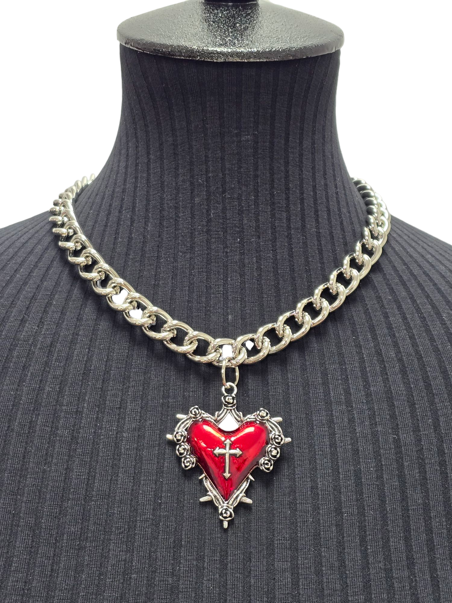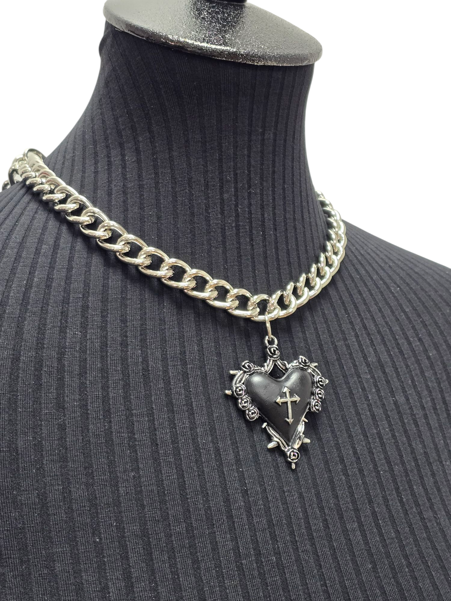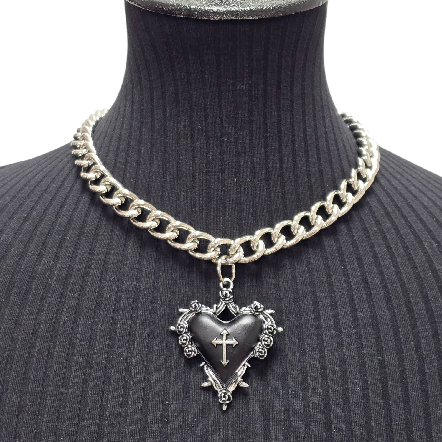 CROSS ROSE HEART THORNE PENDANT 3MM THINK HEAVY STEEL CHAIN 20" LONG Read more