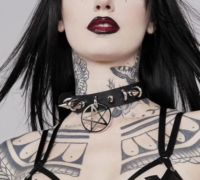 1 1/4" GENUINE-LEATHER CHOKER WITH U RING AND 2" STAINLESS STEEL PENTAGRAM RING AND 1" SPIKE AVAILABLE IN VEGAN BLACK AND RED Read more
